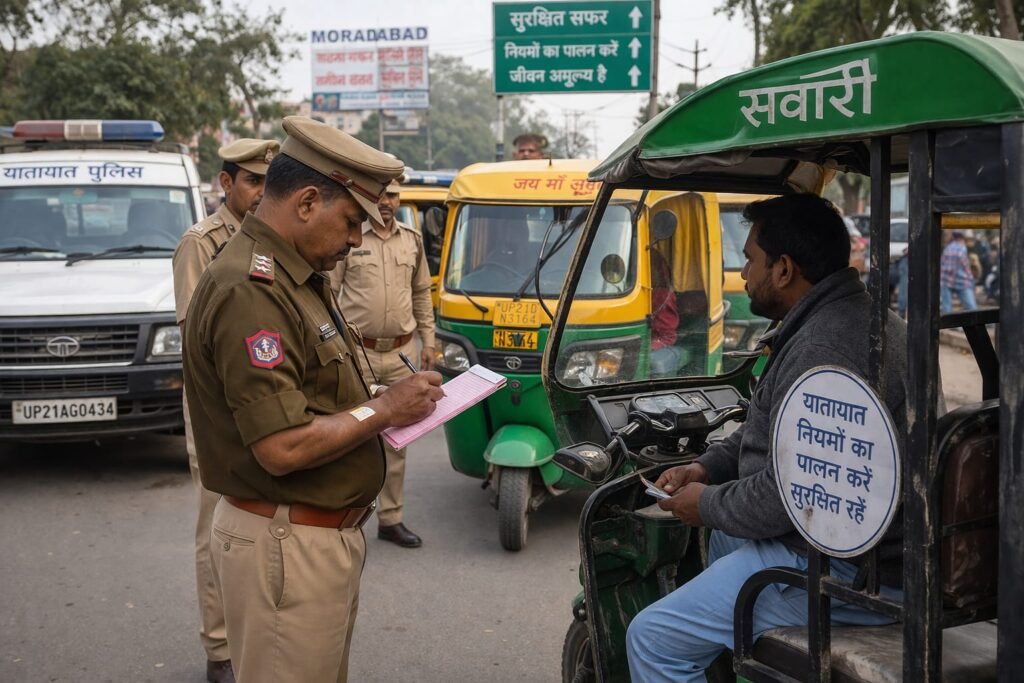 मुरादाबाद प्रशासन ने यातायात नियमों का उल्लंघन करने वालों के खिलाफ सख्त कदम उठाना शुरू कर दिया है। खासतौर पर ई-रिक्शा और ऑटो चालकों पर बड़ी कार्रवाई देखने को मिल रही है।बिना परमिट चलने वाले और नियमों की अनदेखी करने वाले कई वाहनों के चालान काटे गए हैं। प्रशासन का कहना है कि यह अभियान शहर में ट्रैफिक व्यवस्था को सुधारने और यात्रियों की सुरक्षा सुनिश्चित करने के लिए चलाया जा रहा है।अधिकारियों ने साफ किया है कि आगे भी यह कार्रवाई जारी रहेगी और नियमों का पालन न करने वालों के खिलाफ सख्त कदम उठाए जाएंगे। वहीं, नियमों का पालन करने वाले चालकों को किसी तरह की परेशानी नहीं होगी।
